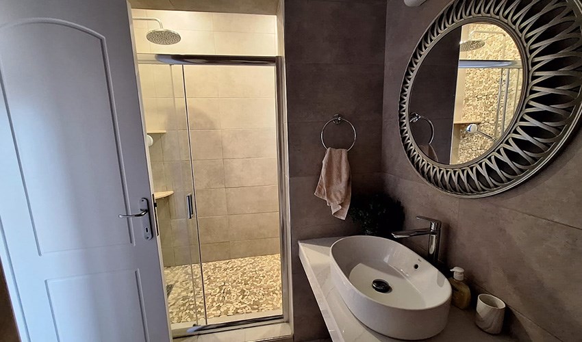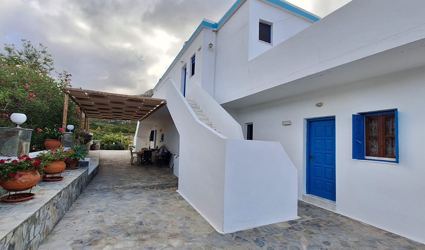 V případě větších vln je možnost vcstupu do vody na inzerované blízké pláži omezená. Buď musíte být schopni se dostat přes velké balvany nebo jít na 1,5 km vzdálenou písčitou pláž do městečka Lefkos.