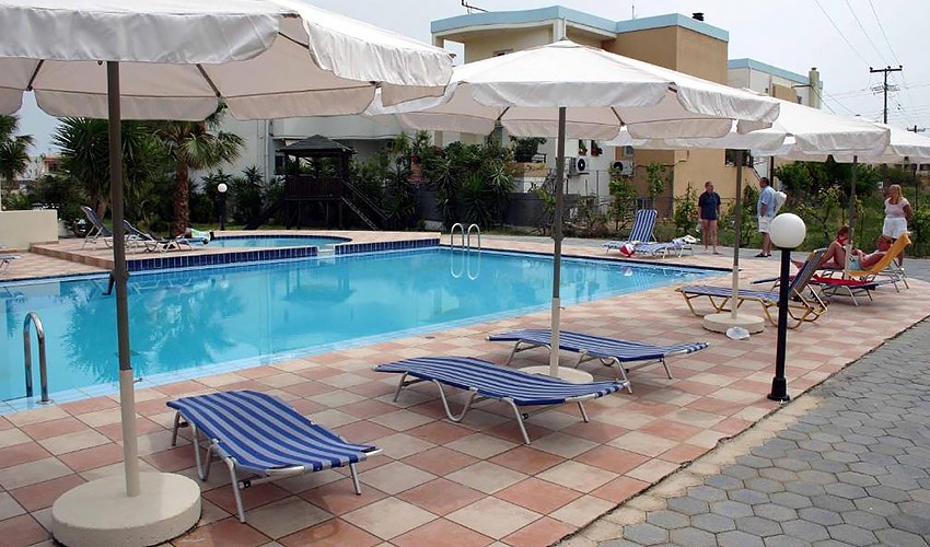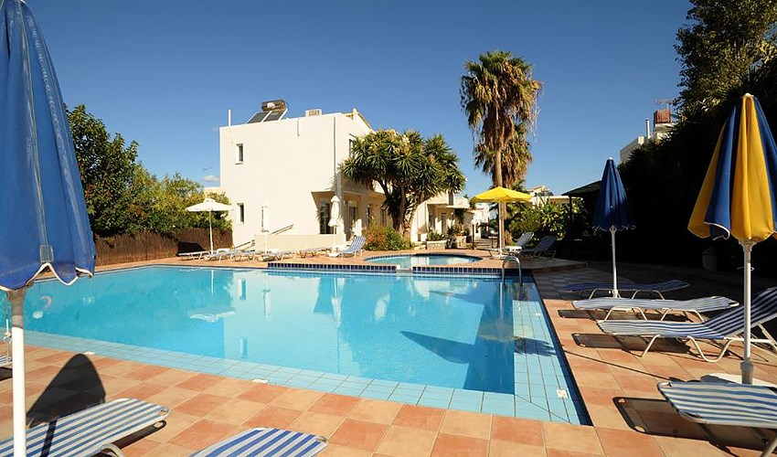 Aparthotel je situován v rušném letovisku Stalos, které se nachází v severozápadní části ostrova Kréta. Letovisko leží 22 km od letiště a 7 km od přístavního města Chania. Prostorná studia a apartmány jsou vybaveny koupelnou, kuchyňským koutem s jídelním stolem, klimatizací, trezorem a setem na přípravu čaje a kávy. V areálu je pro hosty k dispozici bazén s mělkou částí vhodnou pro děti, dětské hřiště, restaurace a bar. V blízkosti hotelu se nachází nákupní možnosti, restaurace a taverny. Dlouhá písečná pláž s jemným pískem a pozvolným vstupem do moře je vzdálena pouhých 100 m přes místní komunikaci. Na své si přijdou i milovníci vodních aktivit, kteří mohou na pláži využít např. školu surfování. Doporučujeme párům i rodinám s dětmi.