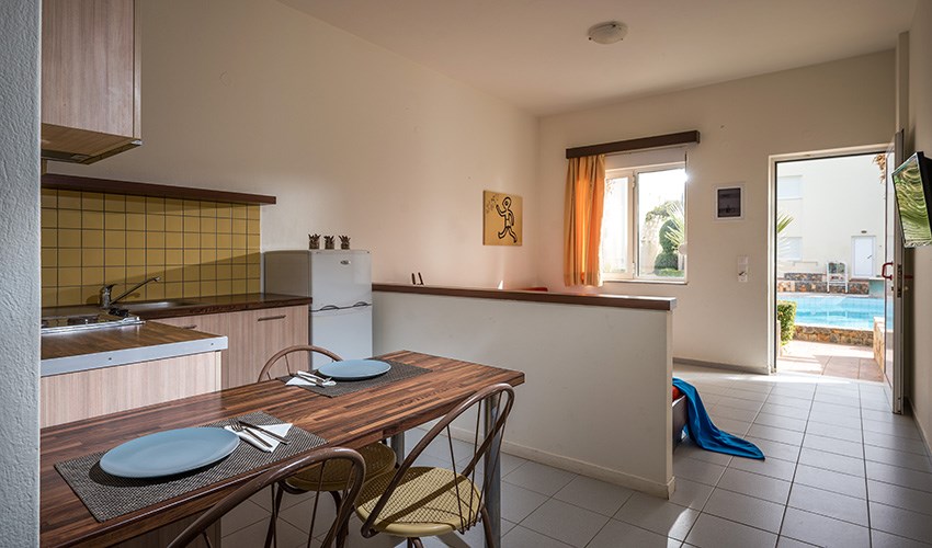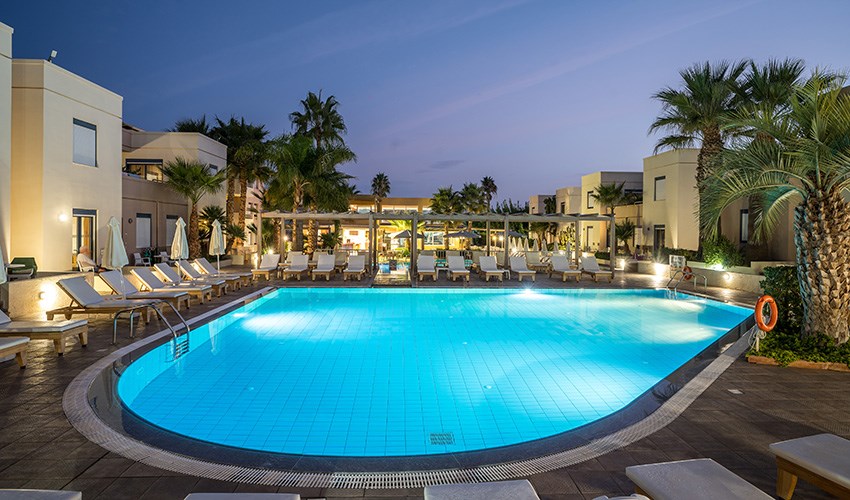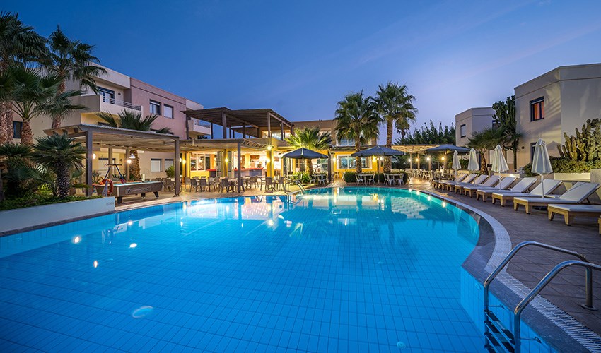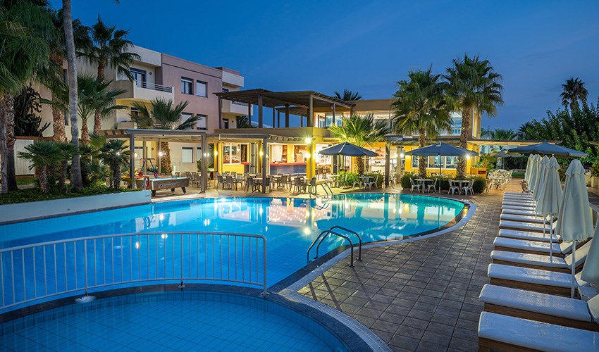 Oblíbený aparthotel se nachází necelých 10 minut chůze od centra živého letoviska Malia. Od písečné pláže s pozvolným vstupem do moře ho dělí 150 m. Tento velice příjemný aparthotel je díky svému zázemí a nově postavenému aquaparku ideální pro rodiny s dětmi. Výhodou je také blízkost centra s nepřeberným množstvím taveren, obchůdků a barů.
