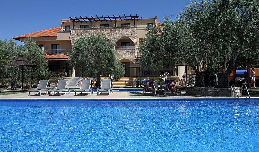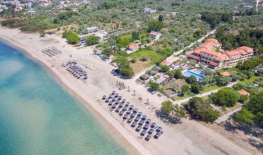 Elegantní hotel je situován v krásné zahradě přímo u široké pláže na okraji letoviska Potos. Hlavní předností tohoto hotelu je klidná poloha přímo na břehu moře u písečné pláže (místy s oblázky). Vzdálenost od centra městečka Potos je 500 m a naleznete zde pobřežní promenádu s malými uličkami plných obchodů, restaurací a barů. Do centra městečka lze dojít po silnici nebo také po pláži. Hotel je vhodný pro rodiny s dětmi i pro páry.